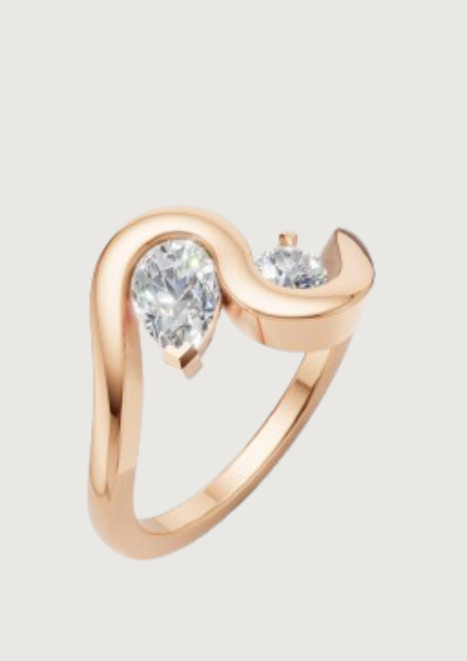 Embrace the flow of everlasting love with the Infinity Wave Dual Diamond Ring. This unique creation features a pear-cut diamond and a round brilliant diamond seamlessly set in a fluid wave-shaped 14K rose gold band. The flowing design symbolizes harmony and eternal connection, making it a striking choice for modern romantics.