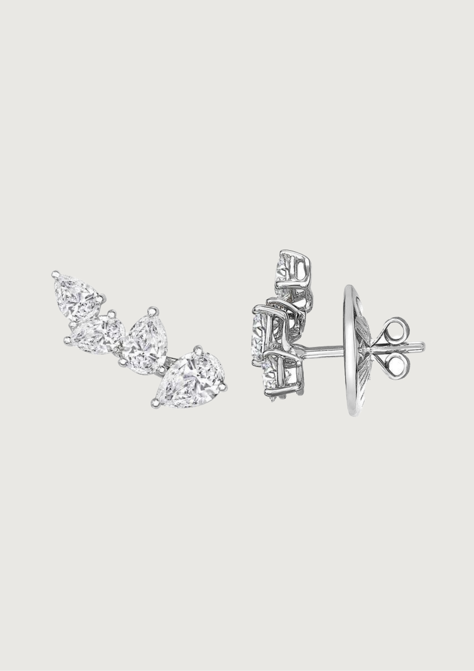 Crafted for effortless glam, the IceLeaf Pear Climber Studs bring delicate drama to your ear. Set in lustrous white gold, these earrings feature a graceful curve of graduated pear-cut stones that mimic the natural flow of falling petals or icy leaves. Designed to climb the ear subtly, they offer a sculptural edge while maintaining ultra-feminine appeal.
